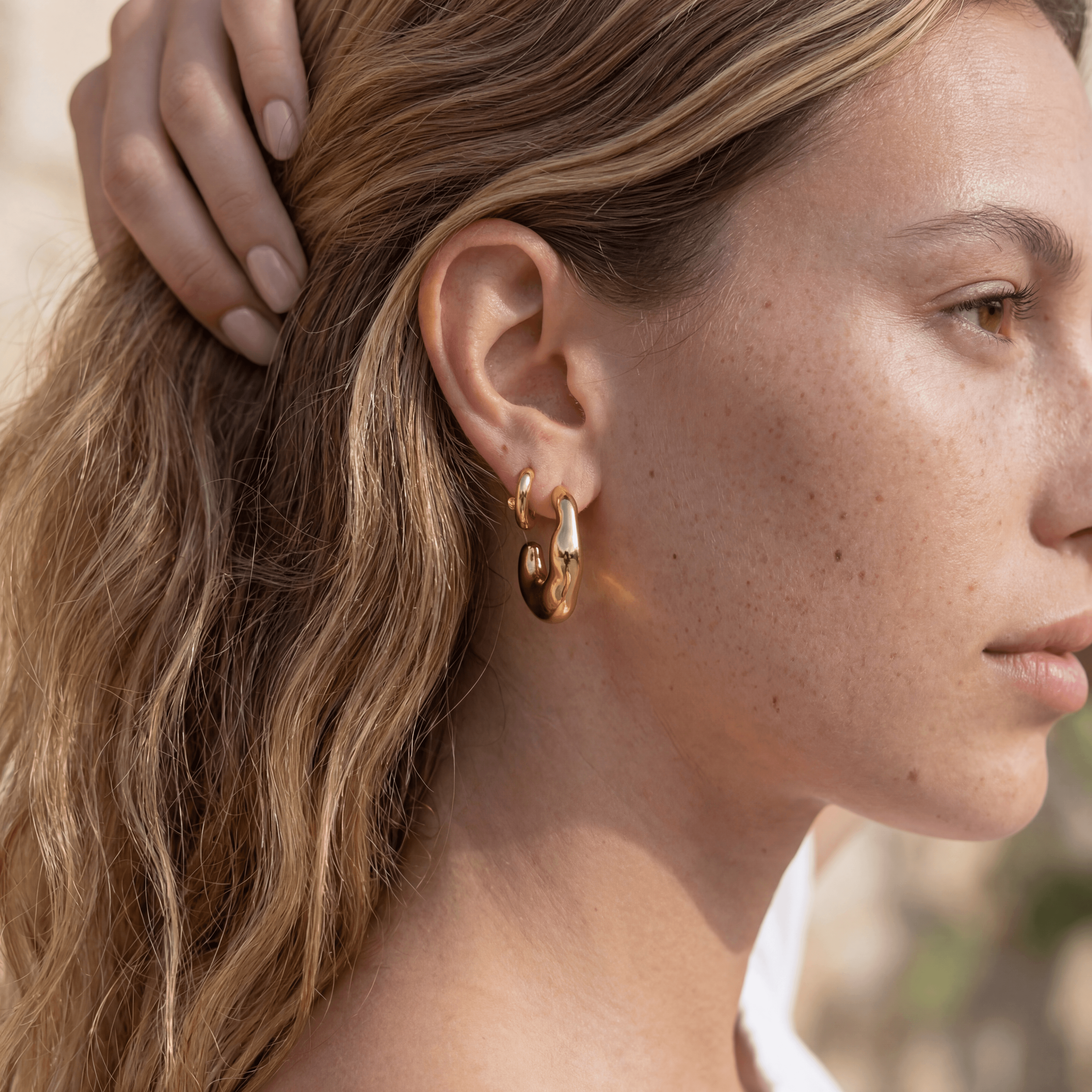 Fluid, modern, and effortlessly cool. The Sculpted Drop Hoop Earrings feature an organic, teardrop-shaped C-silhouette with a smooth, mirror-polish finish that flows like liquid gold. They're the kind of earrings that look like they belong on a fashion editorial — but feel just as right on a beach boardwalk or a sunset cruise.