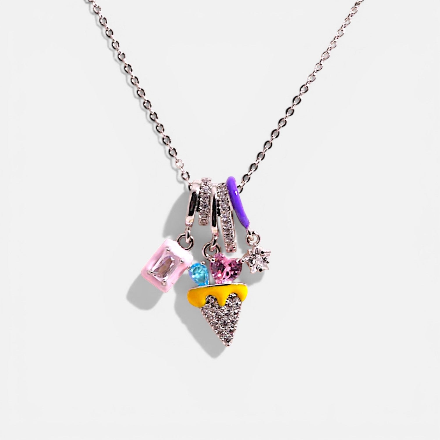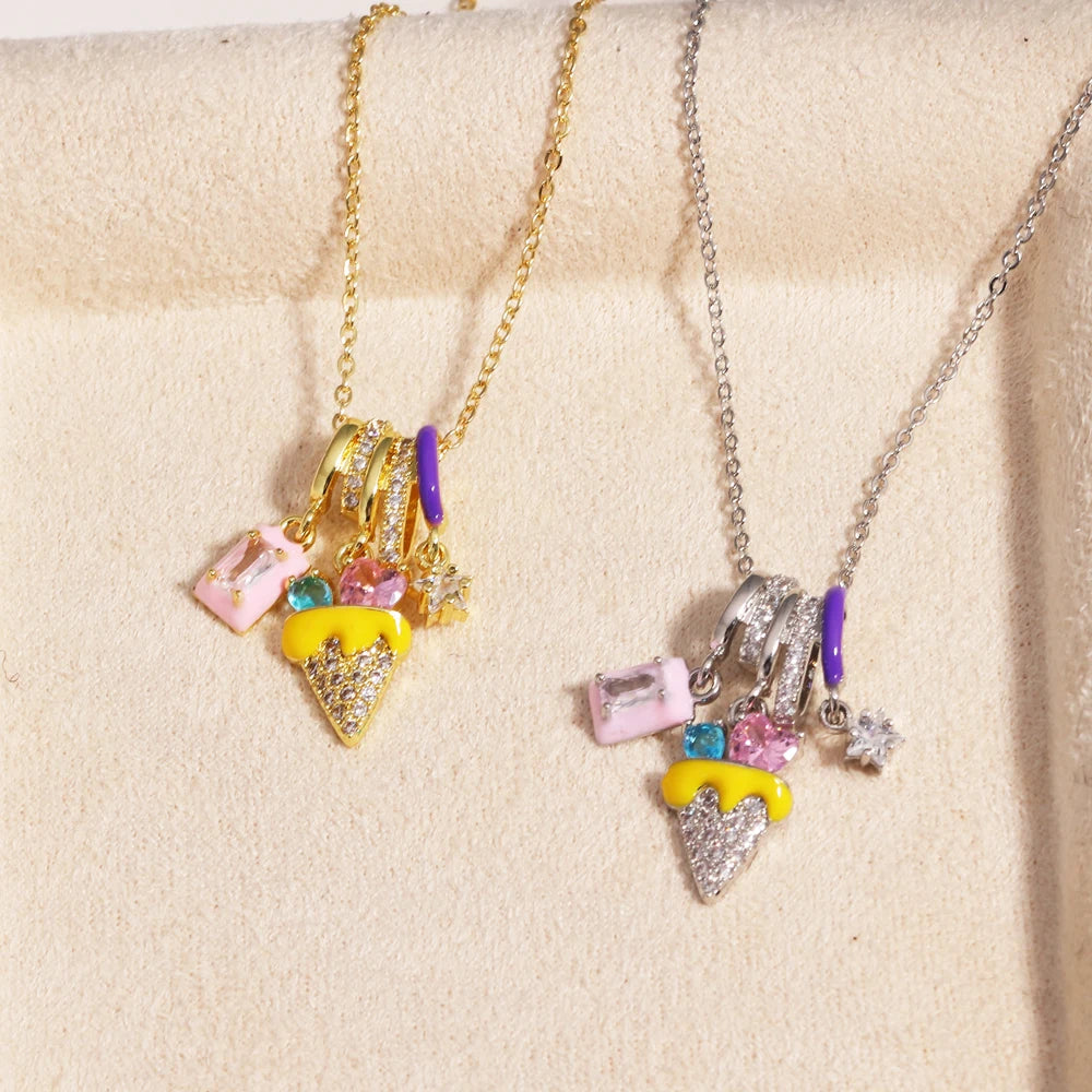Playful, bright, and full of personality, this ice cream pendant necklace adds a fun pop of charm to your jewelry collection. The colorful mixed pendants give it a lighthearted statement feel while still looking polished enough to style with everyday outfits, weekend looks, and anything that deserves a sweeter finish.