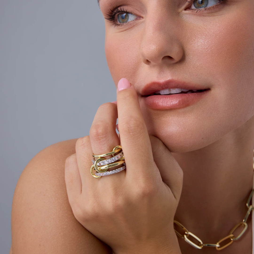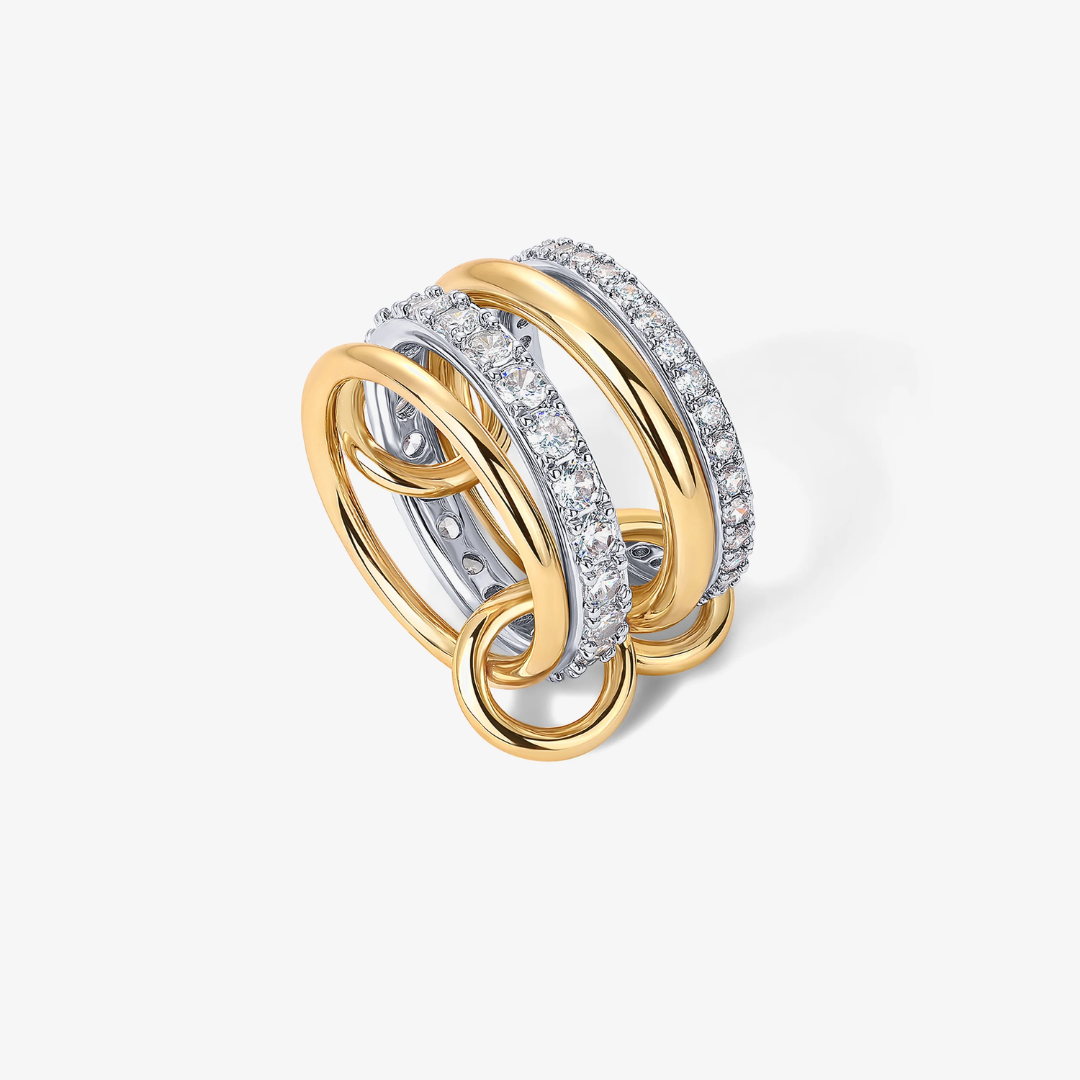 Designed for effortless versatility, this mixed-metal interlocking ring stack lets you create your own signature look. Featuring a balance of slim and bold bands with refined sparkle, each piece can be worn together for layered impact or styled separately for a more minimal feel. The contrast of metals adds dimension, while the delicate stones bring subtle brilliance modern, polished, and endlessly wearable.
